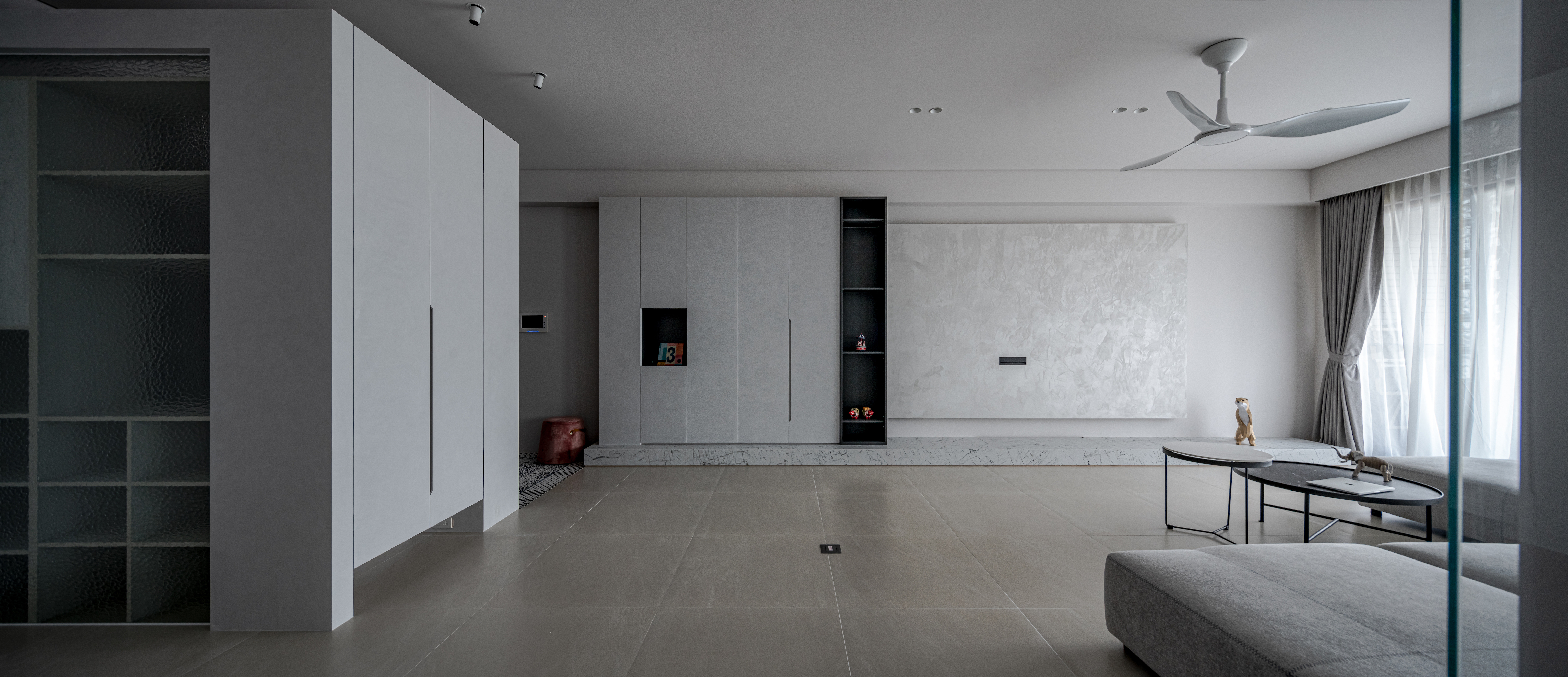 材料: 玻璃磚、水磨石磚、特殊塗料、金屬烤漆、、優白玻璃、木地板