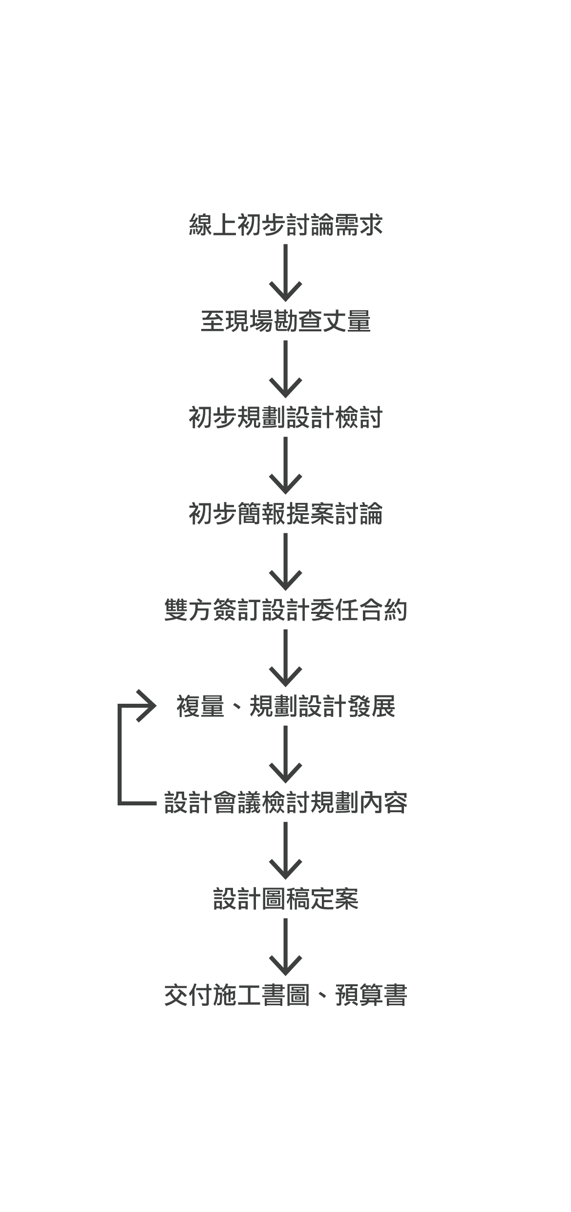 為體現室內設計裝修履歷,從設計規劃、許可申請到工程進行,透過對每個環節的掌握與實質的參與,希冀提供給每個委託人了解並融入屬於自己未來的空間。